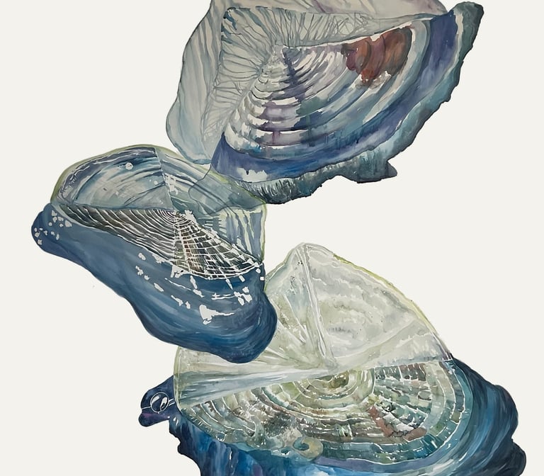 Botanical and marine forms recur as structural frameworks rather than decoration. Oceanic movement, ropes and lines, and reef structures function as metaphors for migration, resilience, and connection. I am drawn to the tension between fragility and permanence, and to the ways images hold memory across geographies.